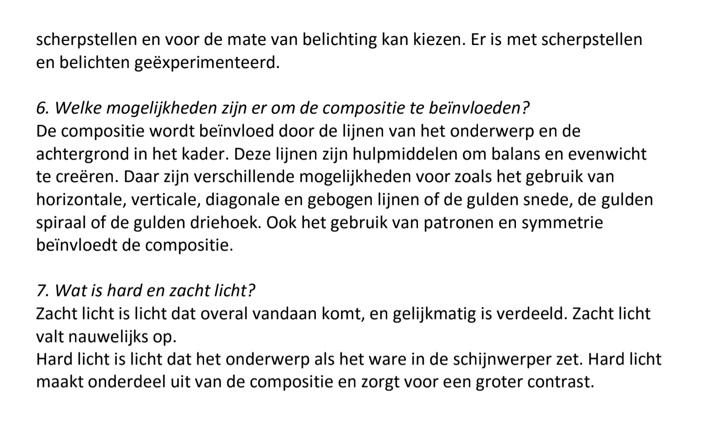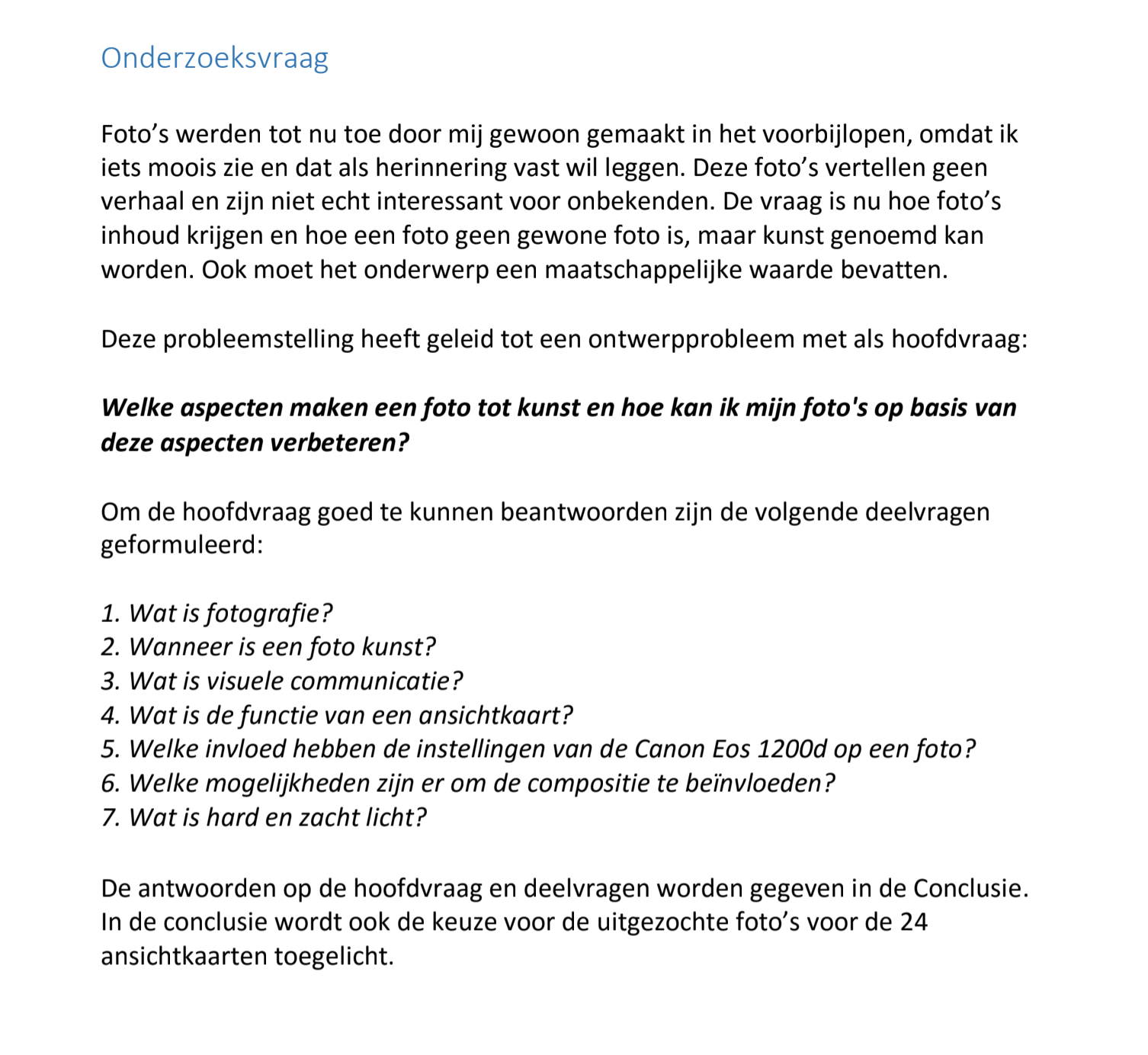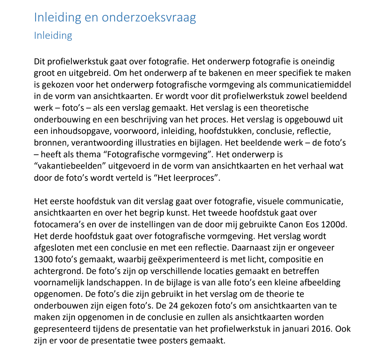 Mijn profielwerkstuk was mijn eerste ervaring met het doen van onderzoek. Omdat ik een creatieve doener ben, heb ik gekozen om met een spiegelreflex camera foto's te gaan maken en te ond erzoeken welke beeldelementen van belang zijn, om een spannend beeld te creëeren. Het resultaat was een verslag als boekje afgedrukt en 24 ansichtkaarten met de beste foto's. Hieronder zijn de voor- en achterkant te zien en een aantal pagina's te lezen.